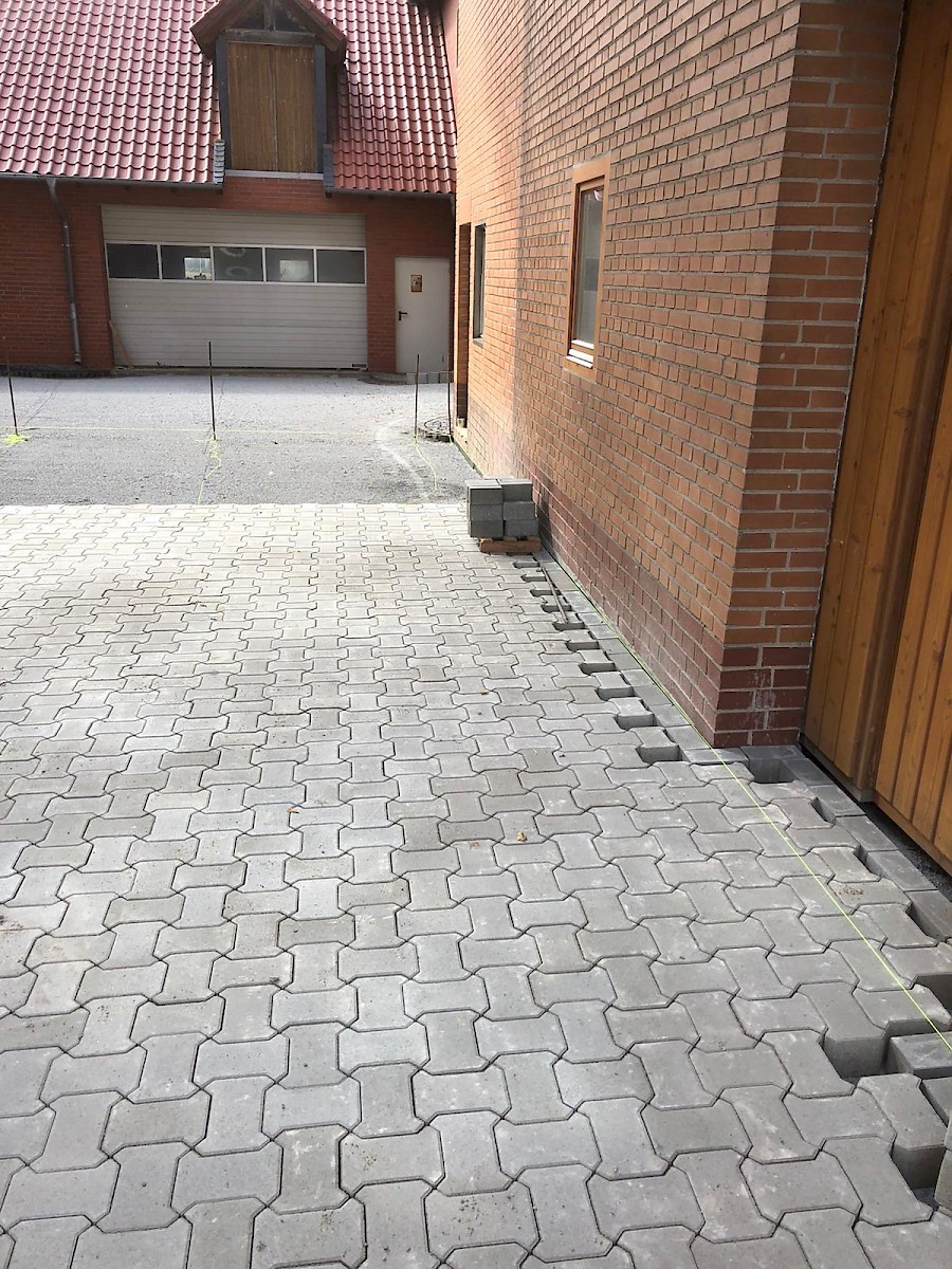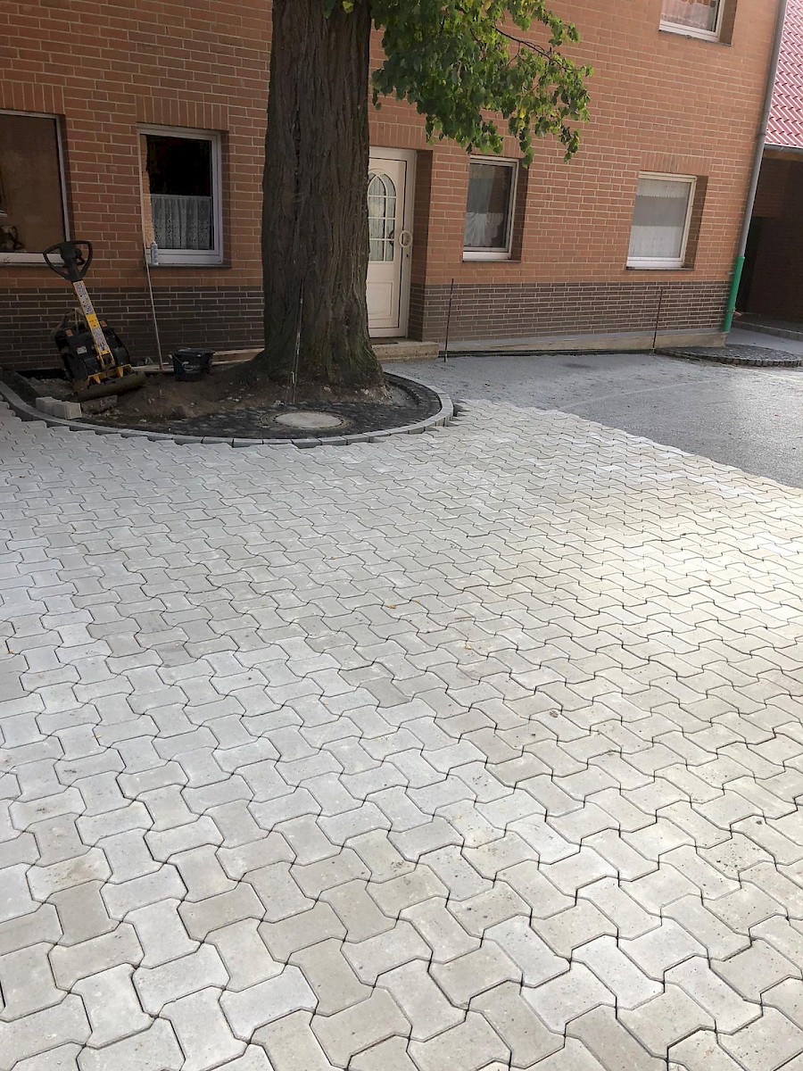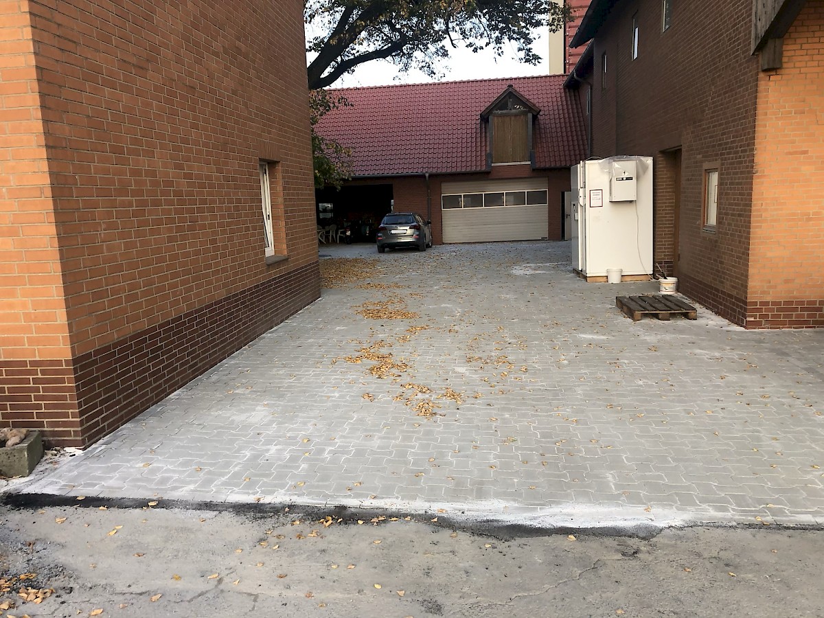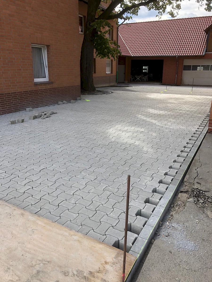 Diese Neugestaltung eines Hofes steht ganz unter dem Motto: neuer, schöner, moderner. Dabei werden die alten Pflastersteine herausgenommen und der gesamte Unterboden ausgetauscht und erneurt. Nach dem Setzen der Borde wird der Hof mit UNI Verbundpflaster aus Beton komplett neu gepflastert.