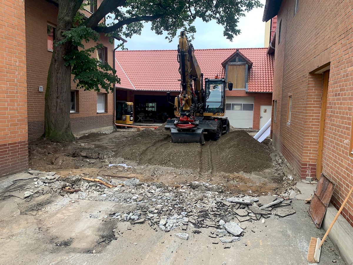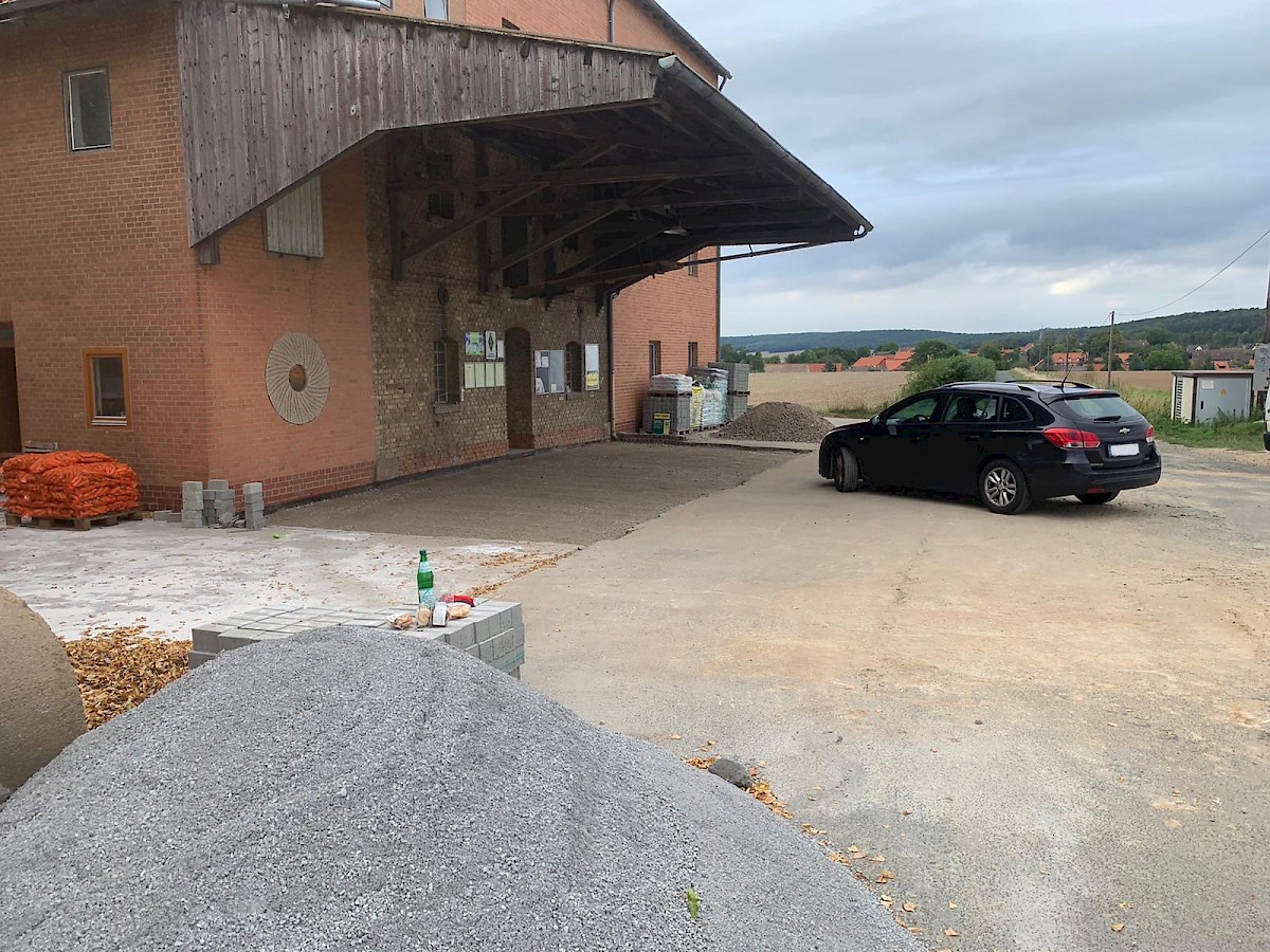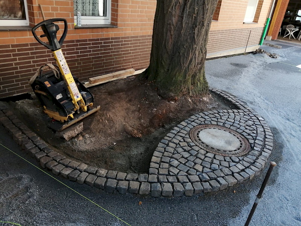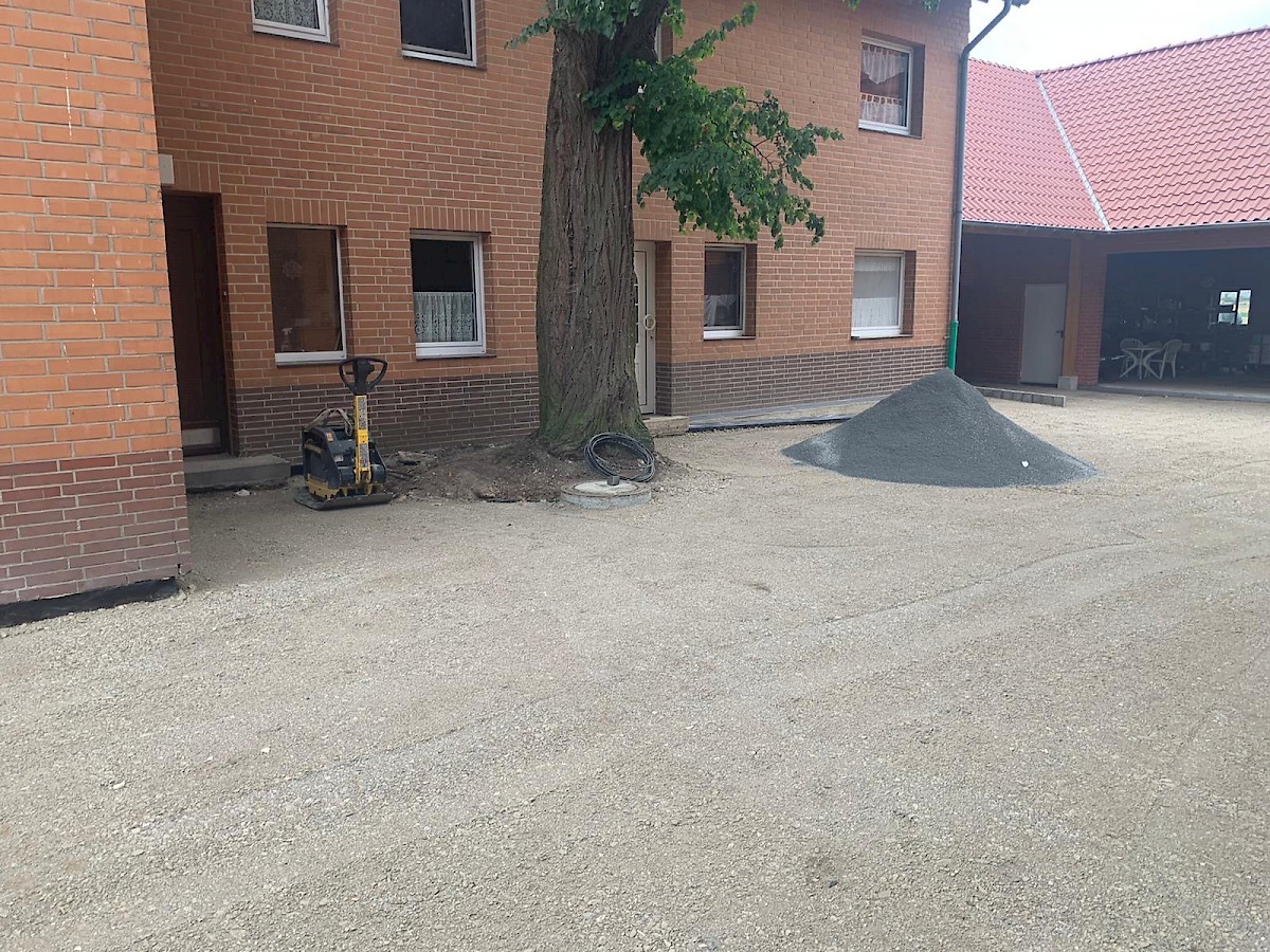 Diese Neugestaltung eines Hofes steht ganz unter dem Motto: neuer, schöner, moderner. Dabei werden die alten Pflastersteine herausgenommen und der gesamte Unterboden ausgetauscht und erneurt. Nach dem Setzen der Borde wird der Hof mit UNI Verbundpflaster aus Beton komplett neu gepflastert.